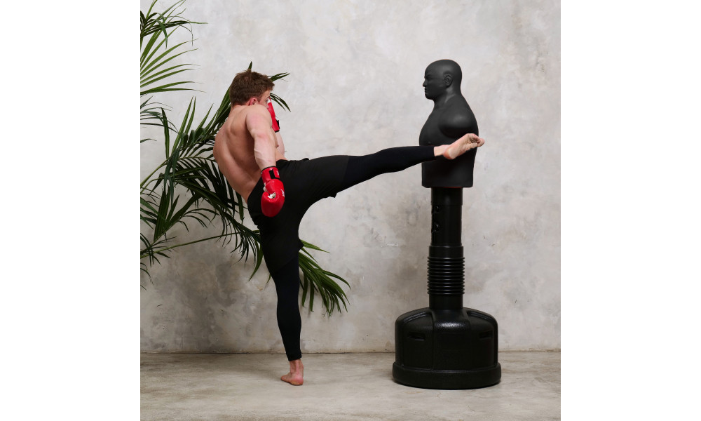 Водоналивной регулируемый манекен DFC CENTURION Man-Medium TLS-HB чёрного цвета - это снаряд для отрабатывания ударов со всех сторон. Спина у данной модели защищена, и по ней можно наносить удары. Реалистичный человекоподобный манекен с покрытием из высокопрочного пластизоля (artificial Rubber mix with PVC). Внутренняя полость заполнена улучшенным пеноуретаном. Манекены CENTURION от DFC увеличили модельный ряд по высоте, что позволяет выбрать наиболее удобный для тренировки. Размеры манекена и основания: Вес манекена – 18 кг Вес упаковки: 21,5 кг Высота в собранном положении: 153 см в нижнем положении и 178 см в верхнем. Высота манекена без колбы – 67 см Размеры манекена в ширину по плечам – 54 см Манекен регулируется по высоте, 7 положений. Объем основания (колбы): 90 литров (можно залить воду, засыпать песок, гравий) Размеры основания (колбы): высота 40 см, диаметр 58,5 см Рекомендации по эксплуатации водоналивных мешков: Ботинками и посторонними предметами по манекену не бить. Не подпускать к манекену животных. Использовать для отработки точечных ударов. При установке манекенов в местах общего пользования и спортивных залах гарантийные обязательства по механическим повреждениям на них не распространяются.