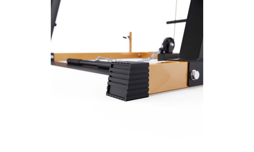 Две пары держателей под штангу стойки для жима легко установить на разной высоте (7 уровней). В качестве нагрузки для верхней и нижней тяги используются диски Ø25 мм. Максимальная нагрузка на тягу до 80 кг. Фиксация с помощью замков, идущих в комплекте. Для хранения дисков предусмотрены 4 держателя по углам тренажера (Ø25 мм). Нескользящие ножки надежно устанавливаются на полу и не царапают поверхность.